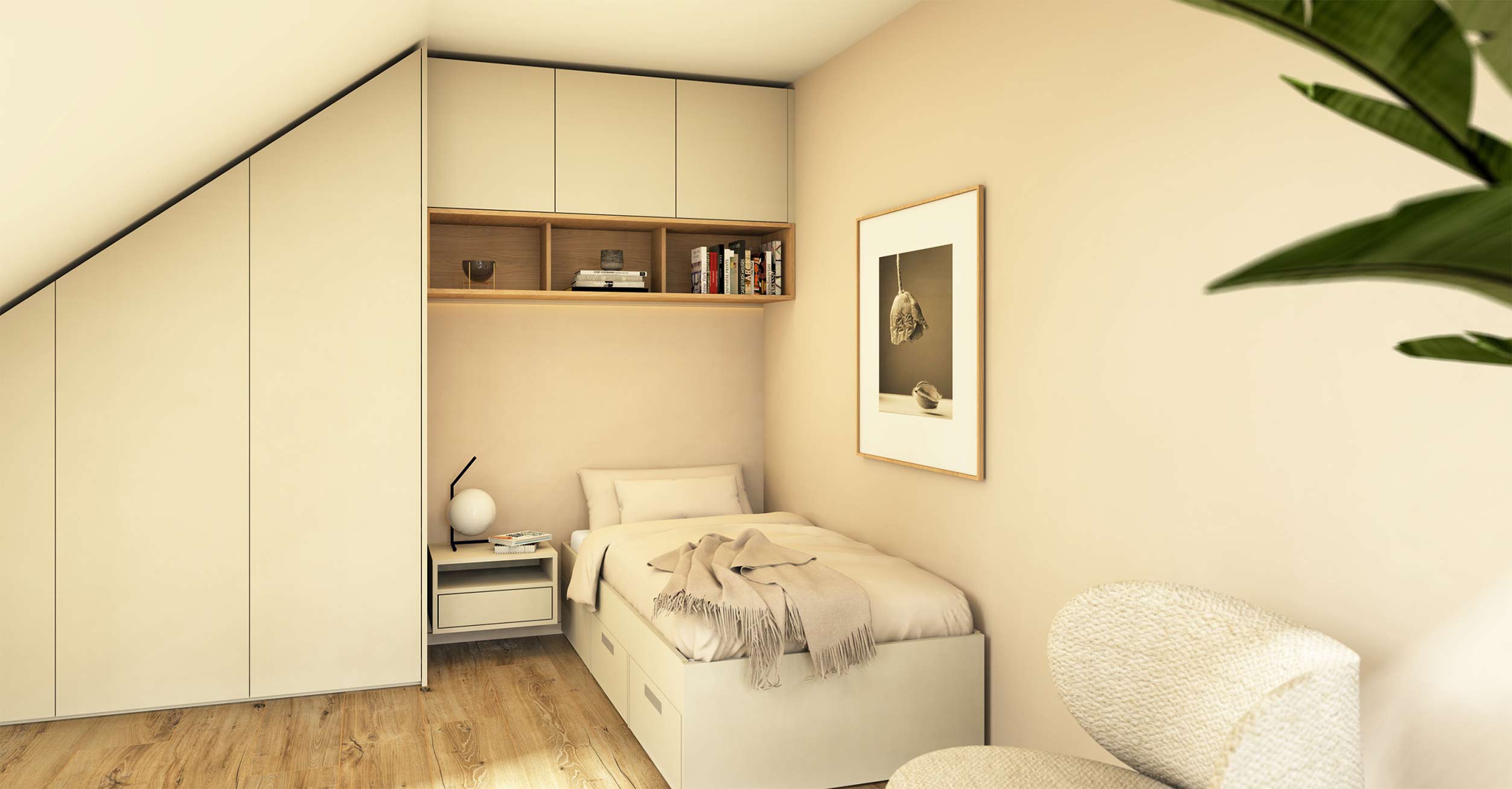 This built-in solution under the sloping ceiling combines several cabinet elements, an open shelf, a box bed with storage space and a floating bedside table to create a harmonious unit. The subtle, warm grey colour lends the room a sense of calm and enhances the clear, timeless design.
