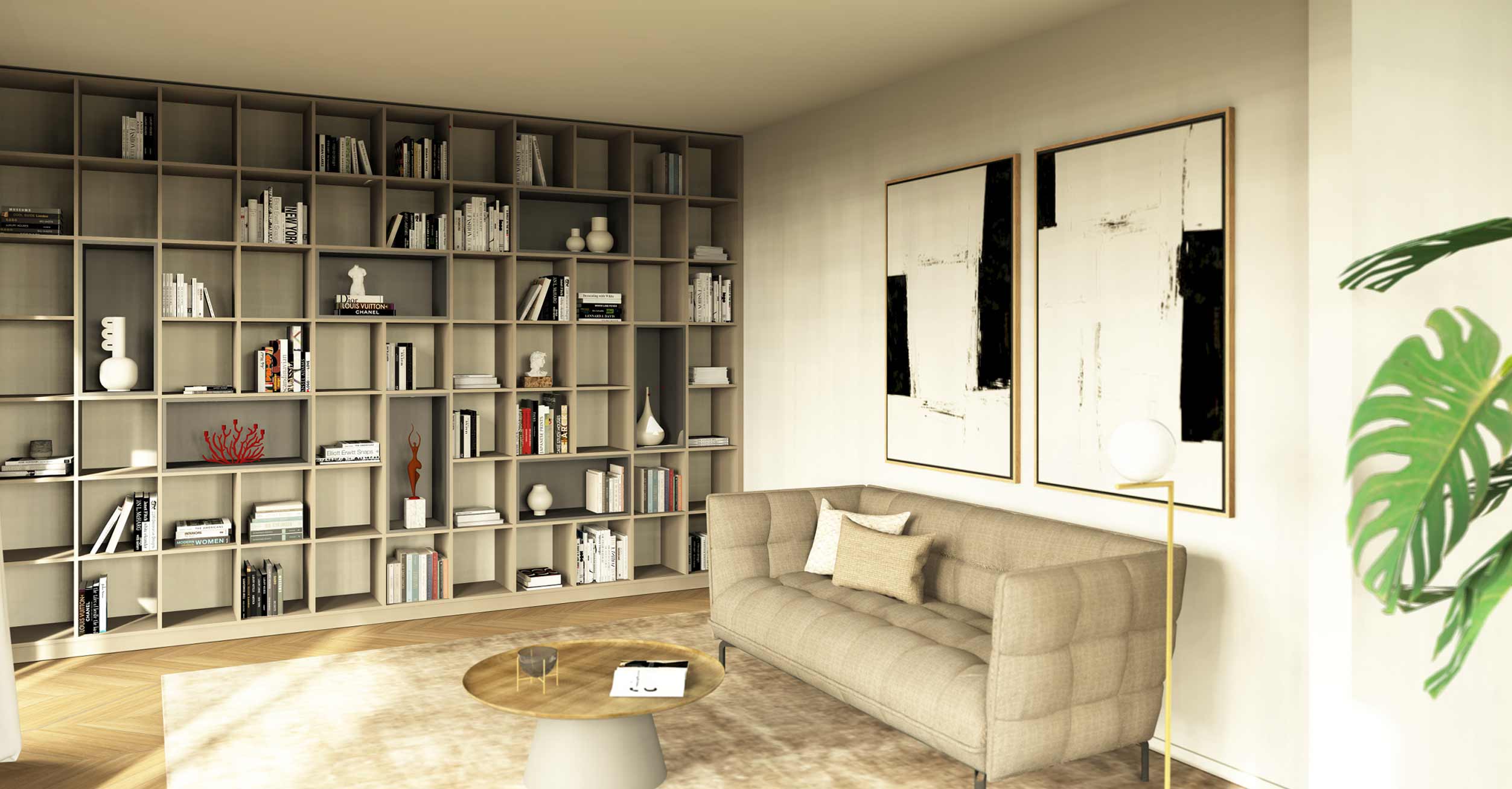 Colour accents in taupe and diamond grey add subtle highlights and are enhanced by integrated spotlights. The result is a bookcase that creates order and at the same time acts as a discreet eye-catcher.