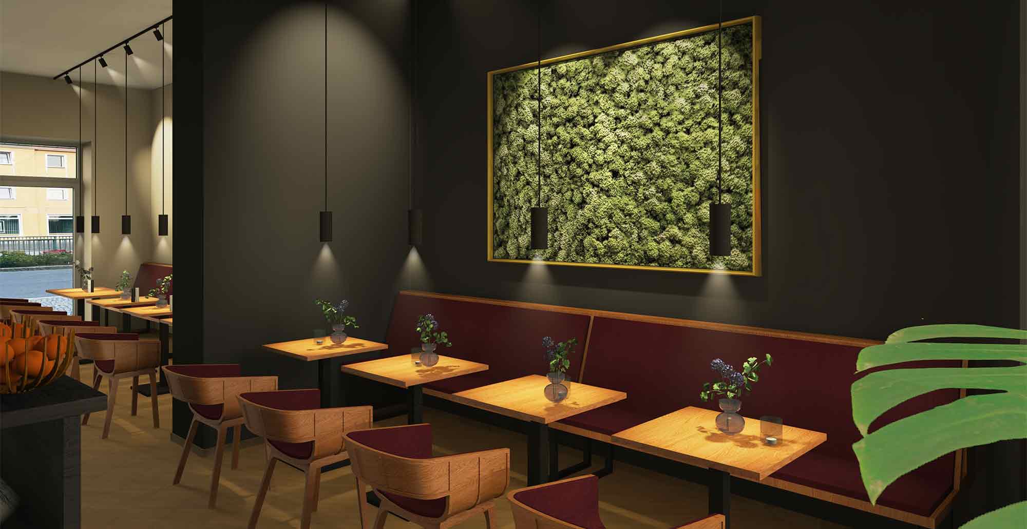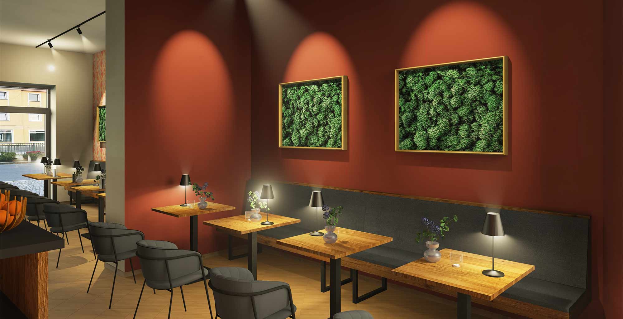 Moss pictures emphasise the natural effect of the wooden furniture and create a calm, organic contrast.