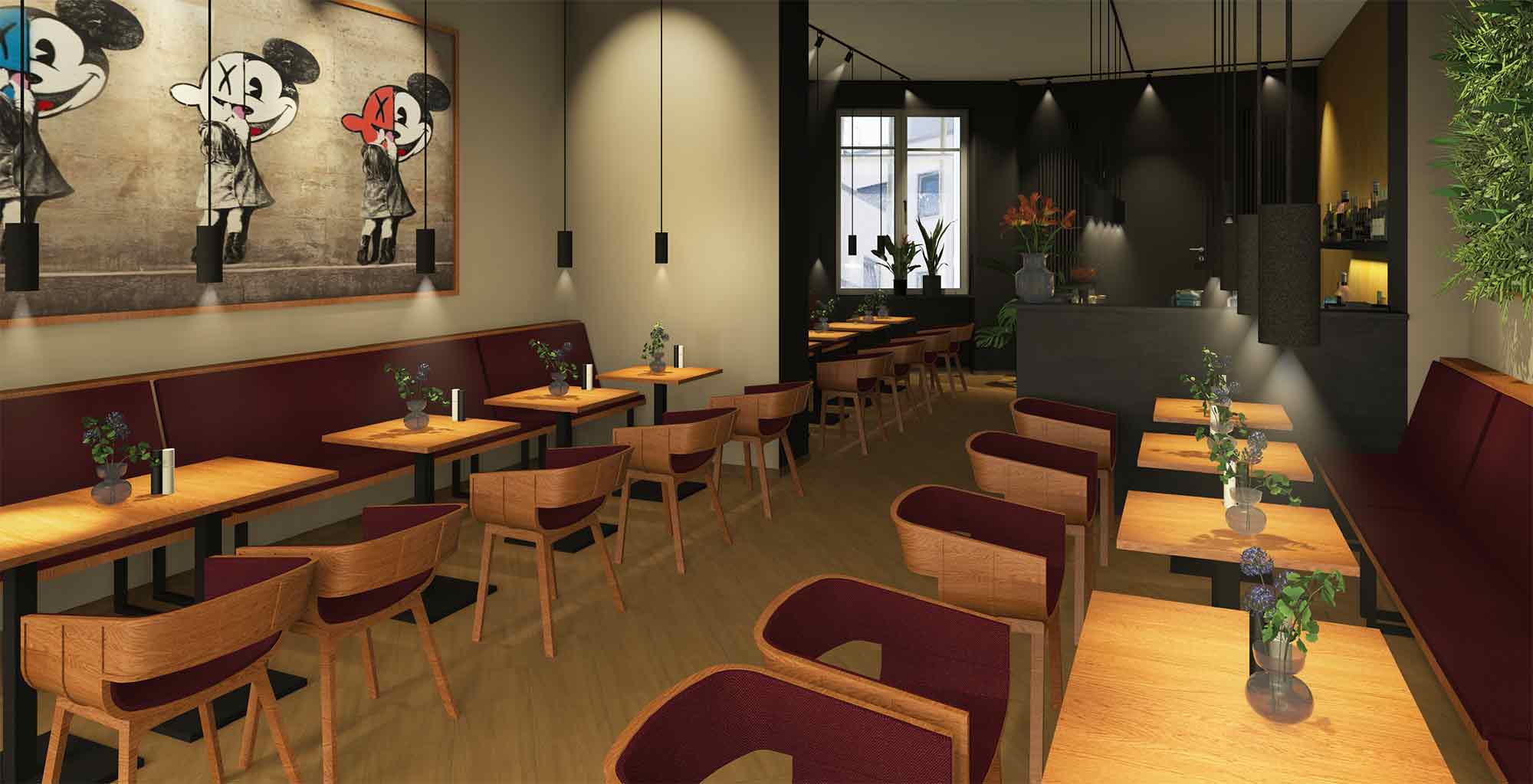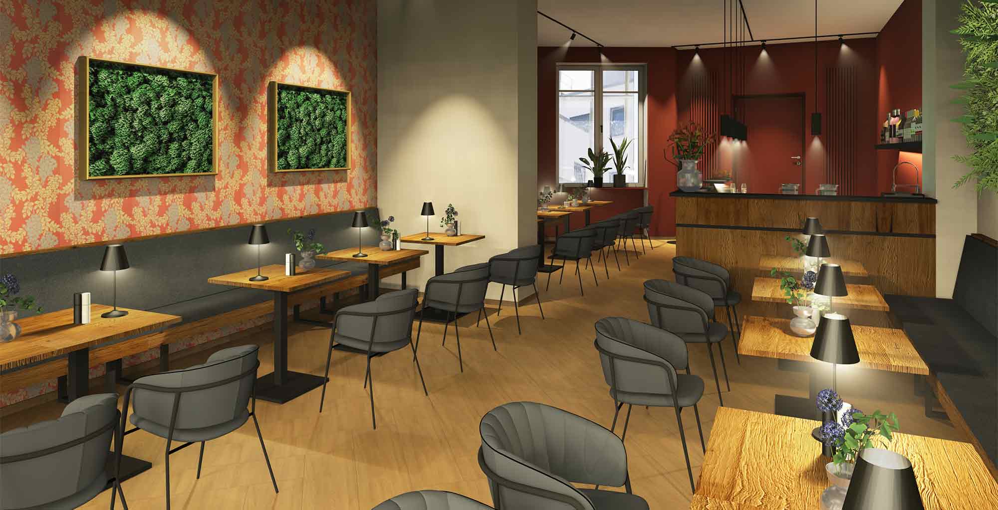 Two design concepts were developed for a restaurant in Falkensee, creating a calm atmosphere during the day and an atmospheric bar effect in the evening. The long, narrow space is divided into a restaurant and bar area – both zones should be visually connected yet retain their own identity.