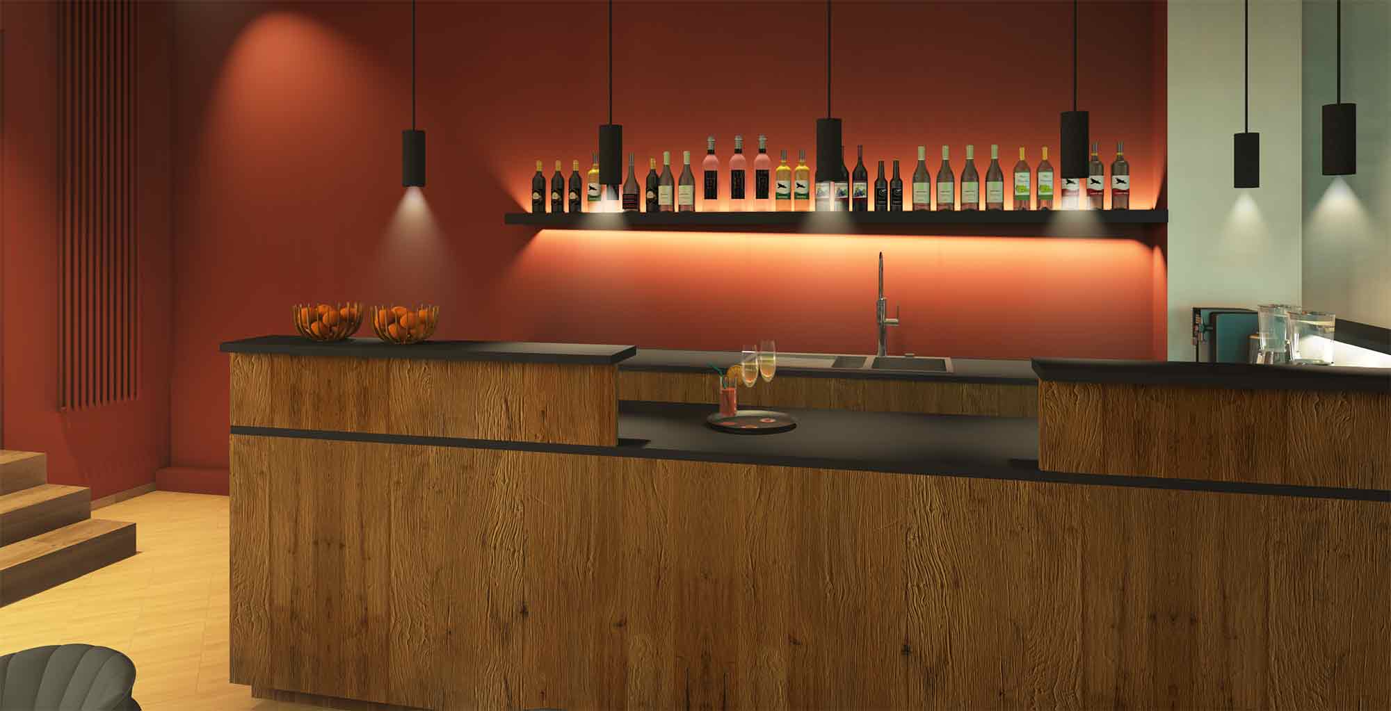 The lighting concept combines a flexible rail system, spotlights, pendant lights at the bar and small table lamps – for a pleasant, warmly lit atmosphere.