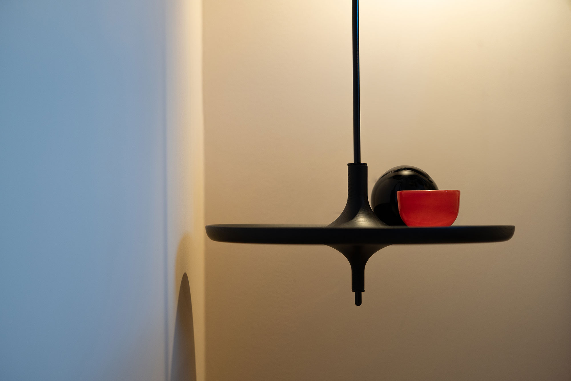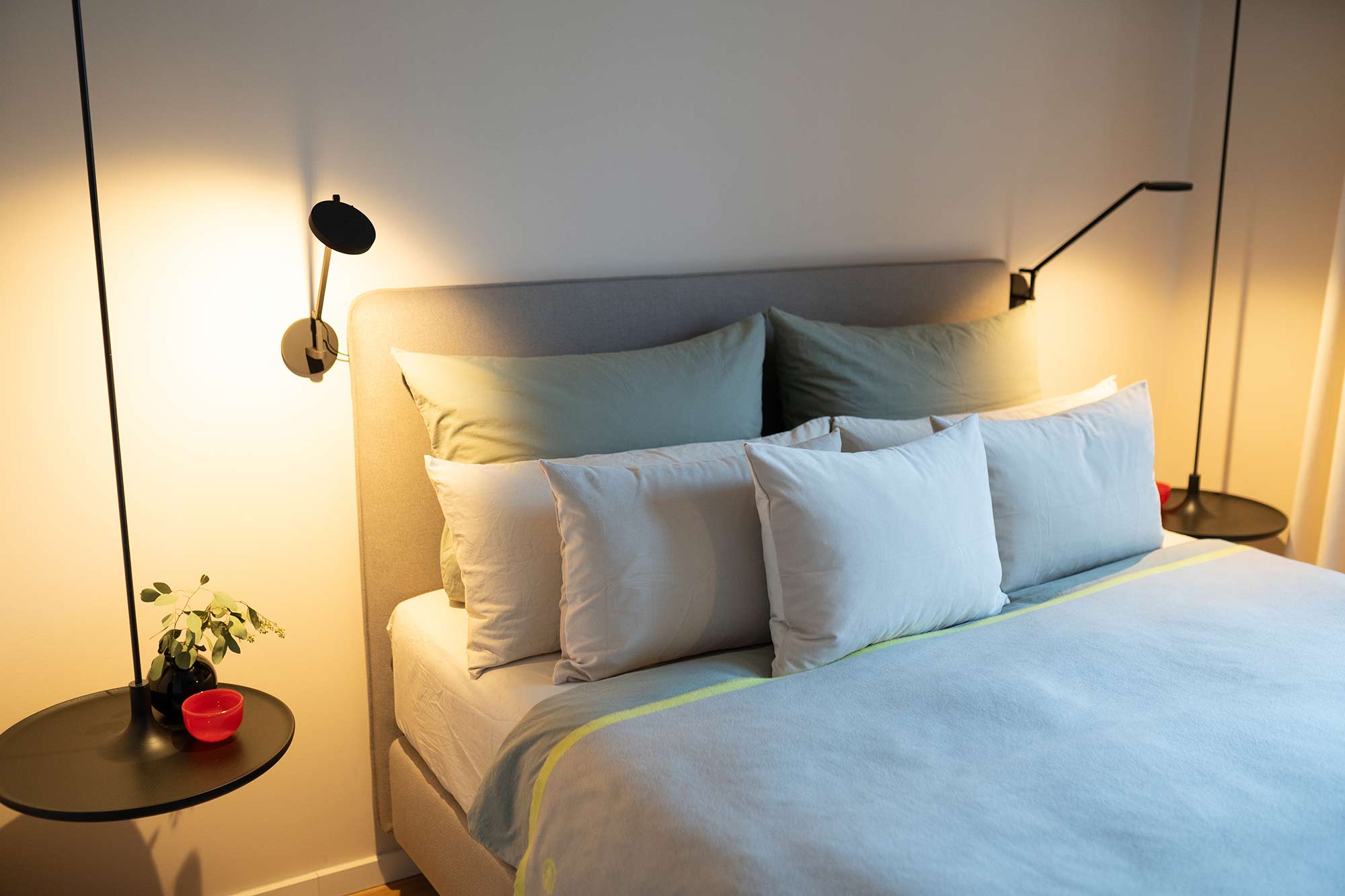 Suspended bedside tables keep the floor clear and frame the bed in a calm manner.