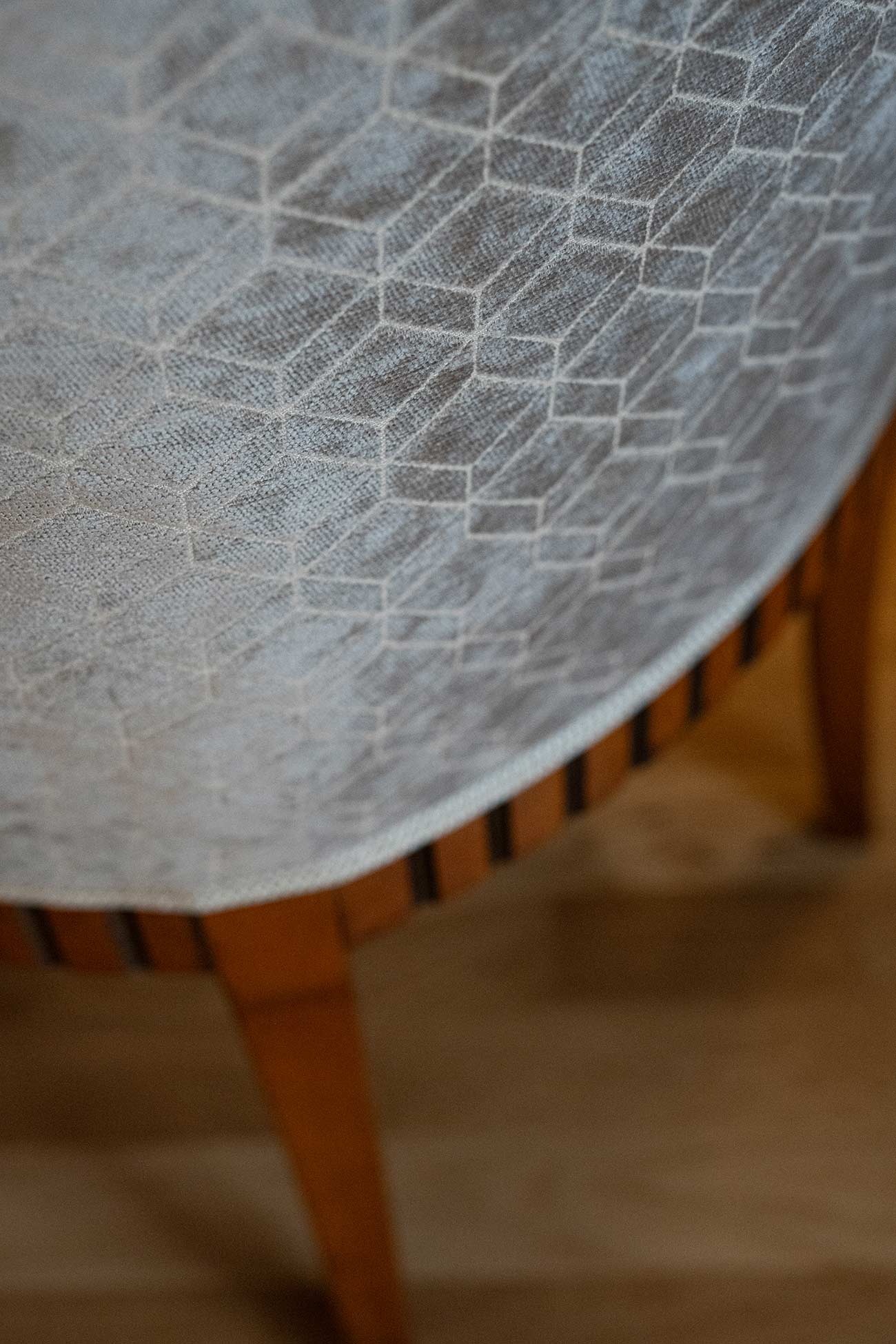 Warm grey and beige tones form a calm backdrop for the antiques and the refurbished Art Deco armchair.