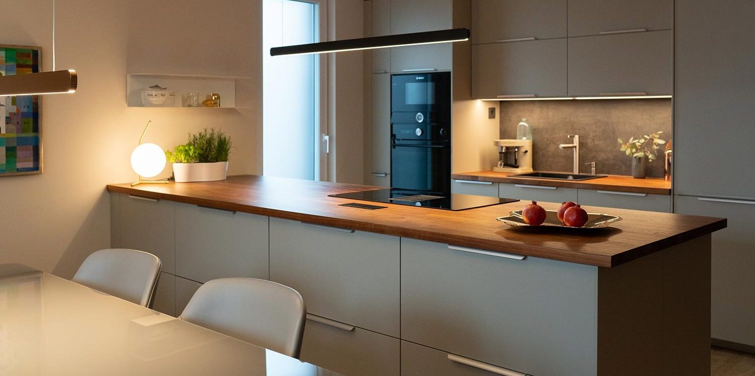 The double-row kitchen solution creates additional work space and naturally separates the dining area. The pull-outs, which can be used from both sides, make everyday life easier without cluttering up the room.