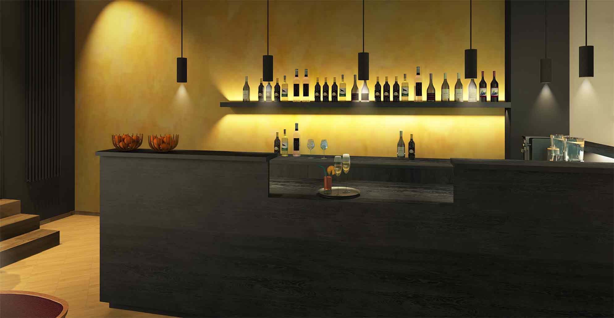 Im Barbereich wird das Farbkonzept fortgeführt und um ein gedämpftes Rot ergänzt. Der Übergang zwischen beiden Bereichen bleibt dadurch weich und atmosphärisch tief.