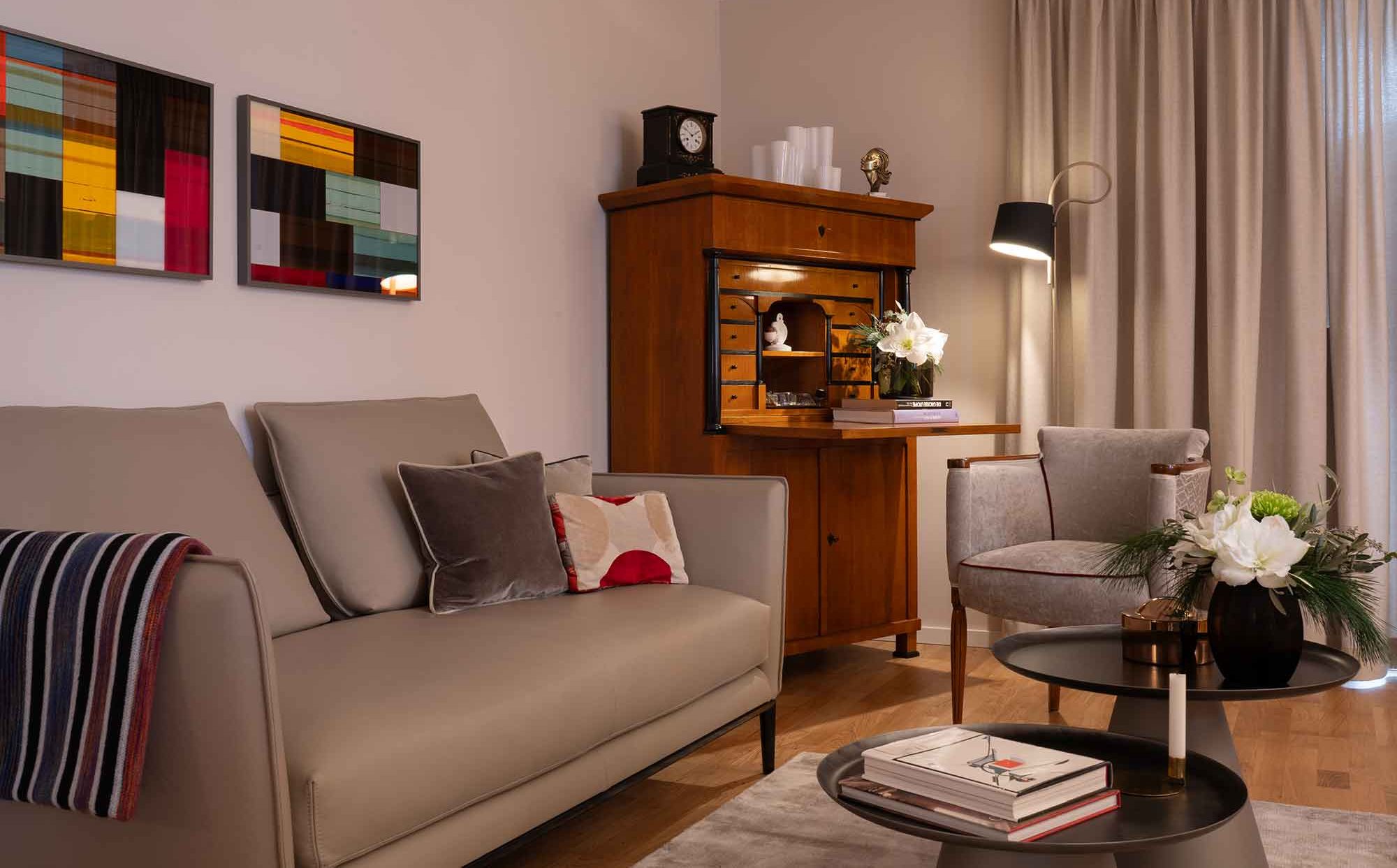 Moderne, zurückhaltende Möbel ergänzen die historischen Stücke und führen die unterschiedlichen Stile zu einem stimmigen Gesamtbild.