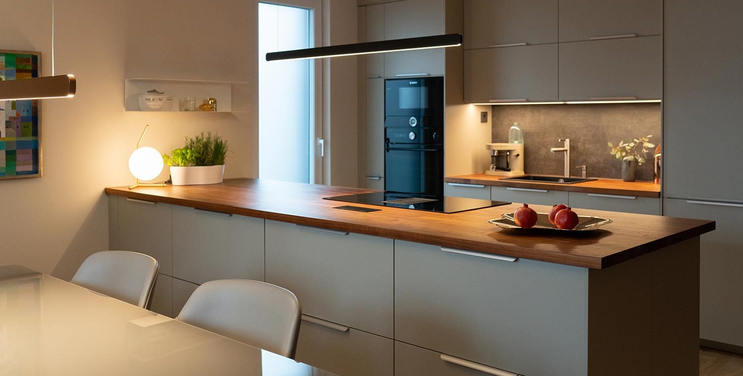Die zweizeilige Küchenlösung schafft zusätzliche Arbeitsfläche und trennt den Essbereich natürlich ab. Die von beiden Seiten nutzbaren Auszüge erleichtern den Alltag, ohne den Raum zu überladen.